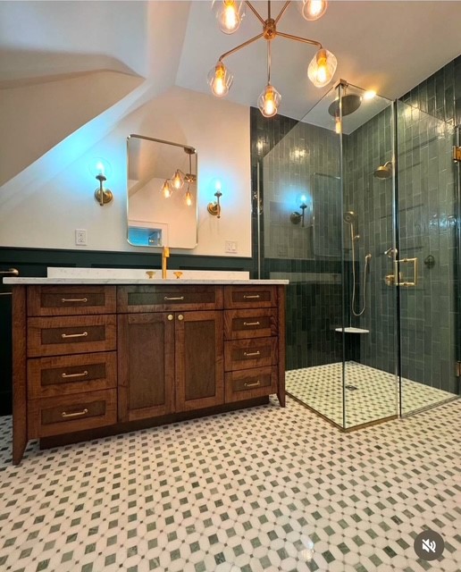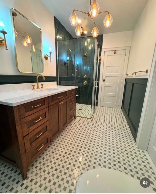 We introduced Carrara marble tiles to anchor the palette with elegance and restraint. The curbless walk-in shower, framed with refined wall panels and complemented by a classic wood vanity and brass hardware, balances function with enduring style. A statement chandelier completes the space, softening the geometry with sculptural light.